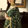 Savor the calming elegance of our Verdant Serenity outfit. This castleton green design, ornamented with zari-work inspired by jewels, exudes a sense of royalty. The flowing kalis for the peshwas capture the essence of a chandbali motif, blending tradition and luxury. Bask in the serene glow and let your elegance blossom with Asim Jofa.