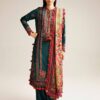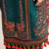 This gorgeous teal blue outfit with intricate paisely motifs embroidery is truly eye-catching. The teal color brings a sense of sophistication while the paisely motifs adds a touch of traditional charm. Its perfect for the winters as it is paired with an apple green printed woolen shawl. This combination of teal and green creates a stunning contrast making you a vision of elegance and style.